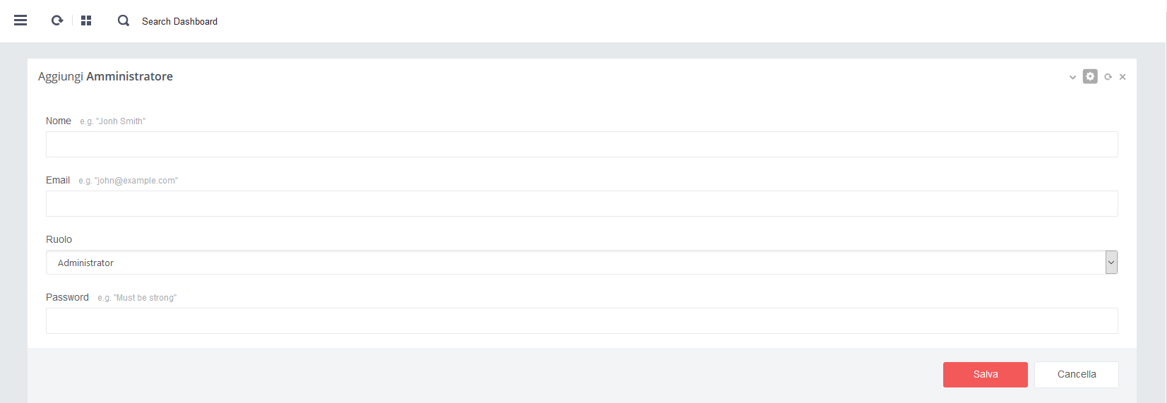 - A. Click su pulsante verde "Aggiungi Amministratore"