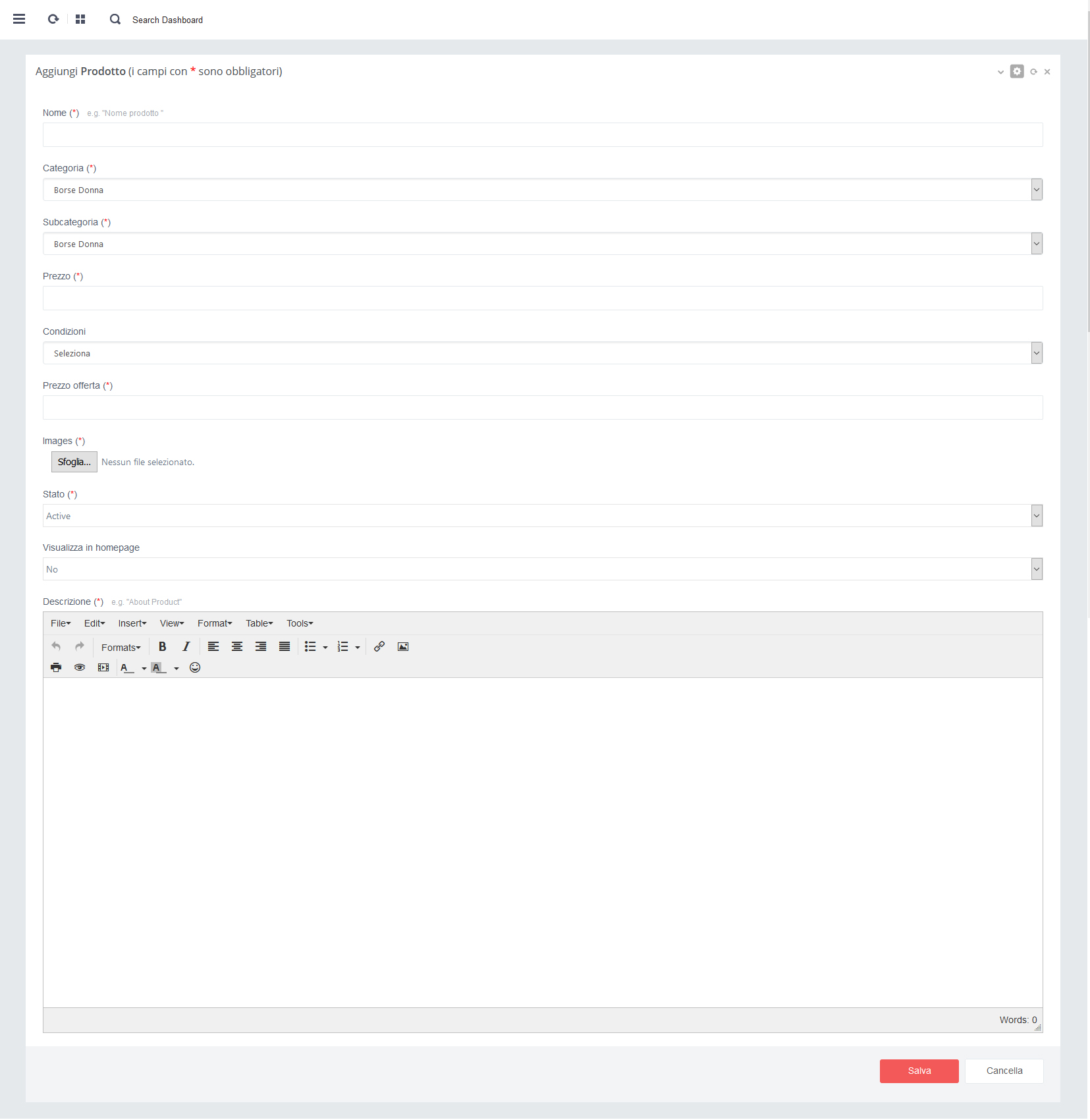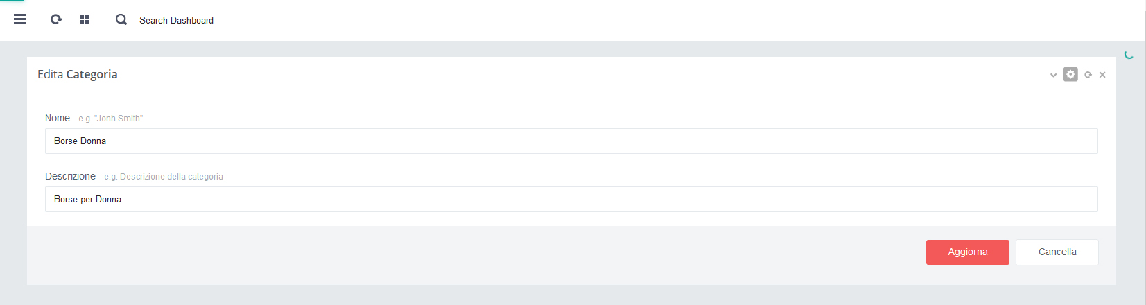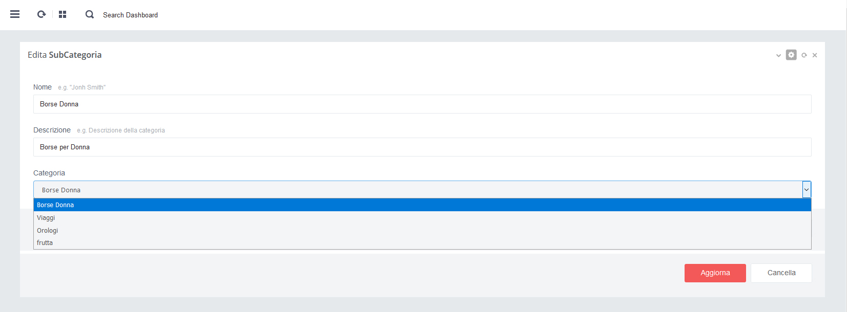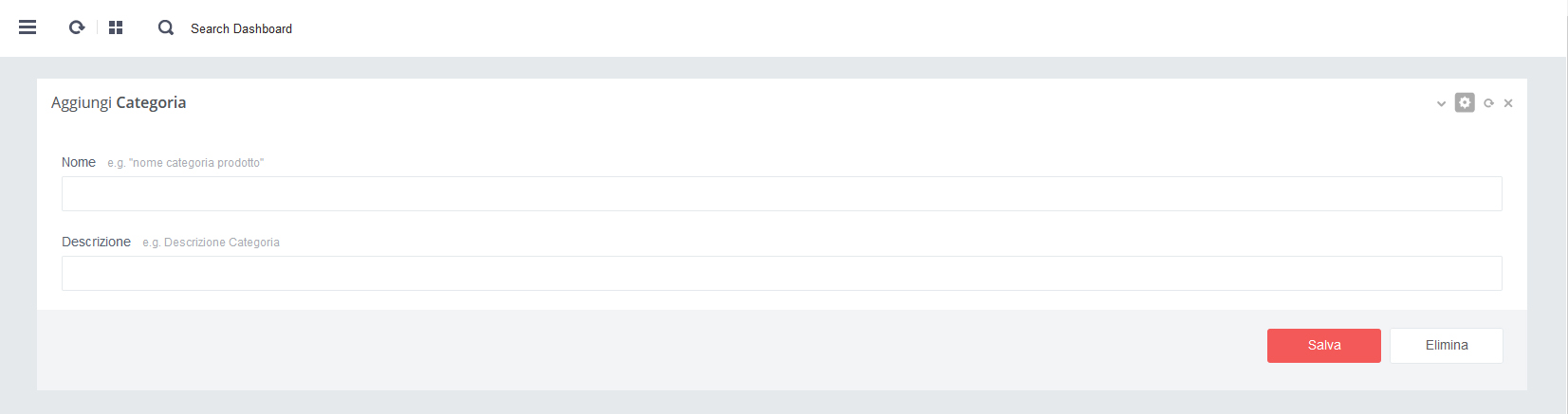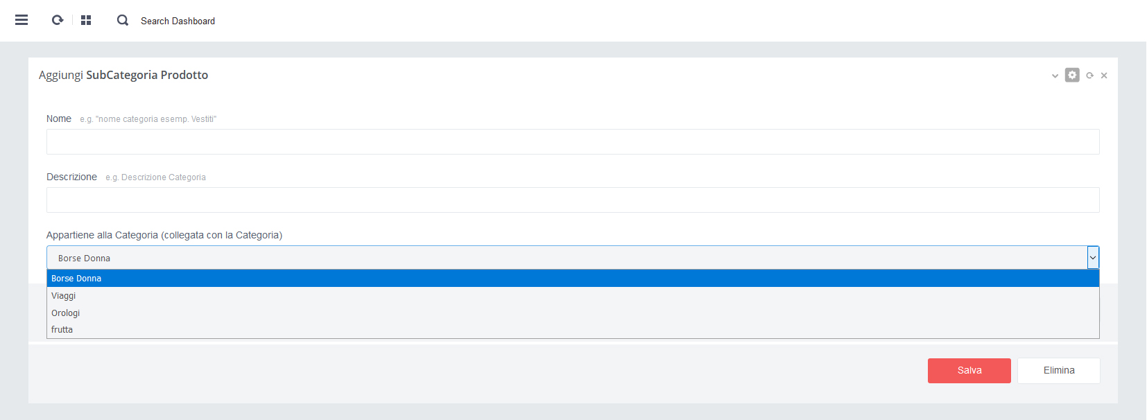 almeno una Categoria nella sezione Categorie Prodotti e almeno una Subcategoria nella sezione Subcategorie Prodotti.