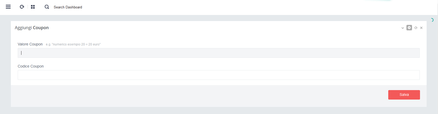 - B. Campo "Valore Coupon" inserire un valore (in euro) es. 30, 50, 150 (senza i decimali)