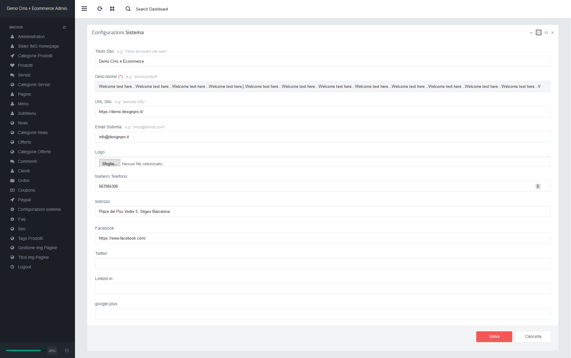 - D. Campo "Email sistema": Inserire la vostra email esempio info@vostrosito.com
