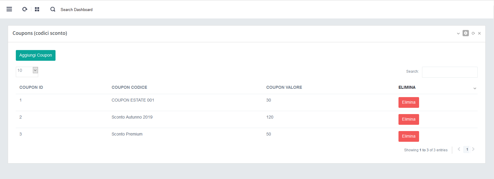 - A. Click su pulsante rosso "Elimina" nell’elenco dei coupon inseriti/creati
