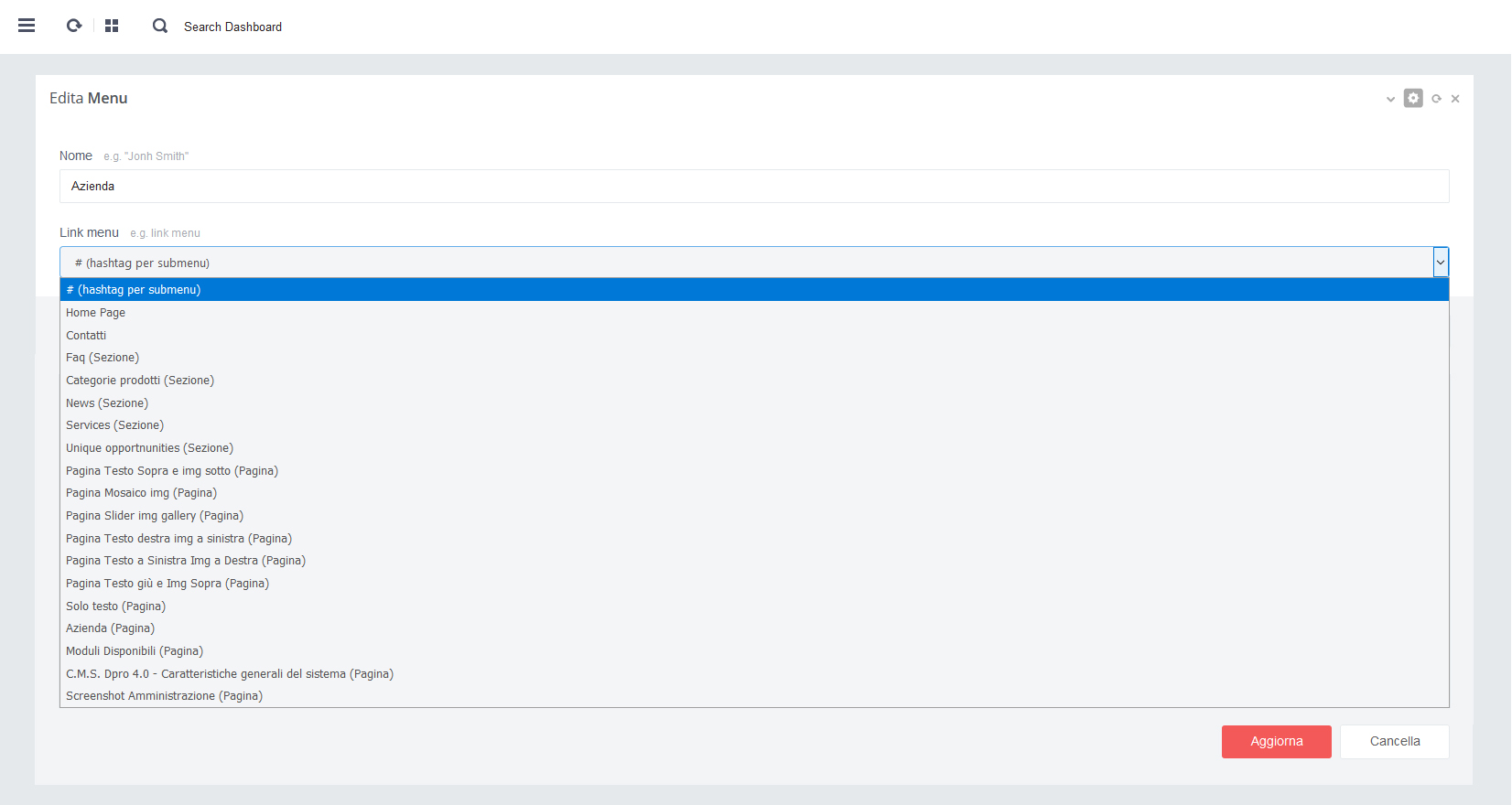 - - campo "Url" inserire in link della pagina da collegare
