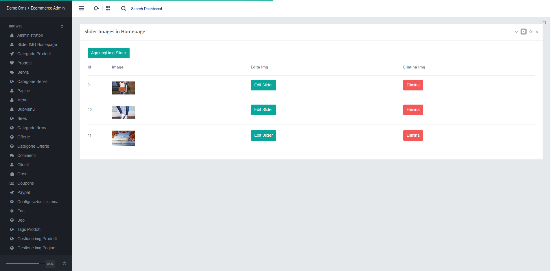 - Per accedere alla gestione slider immagini in homepage , click sul menu di sinistra: "Slider IMG Homepage"
